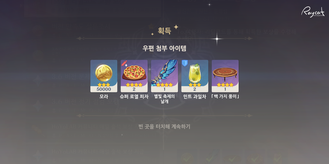 게임 내 우편으로 받은 아이템은 별빛 축제의 날개, 5만 모라, 슈퍼 로열 피자, 민트 과일차, 선계 장식품 '백가지 풍미'가 옵니다.