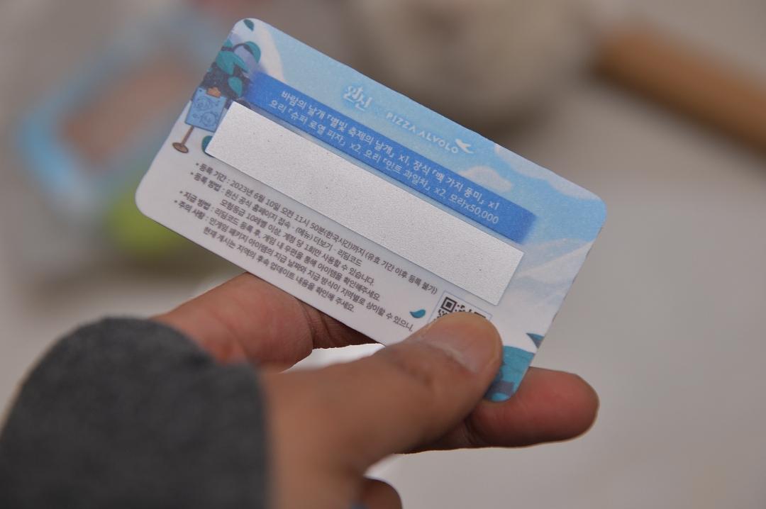 전 굿즈가 아닌 인게임 스페셜 카드를 선택 했는데 스페셜 카드의 뒤쪽을 동전이나 손톱으로 긁으면 리딤코드를 나옵니다. 피자보다 저한테는 이게 더 중요한 아이템이기도 합니다.