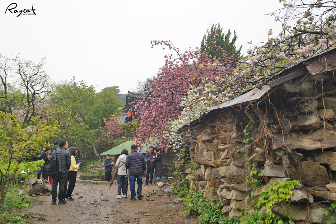 4월 중순이면 관광버스가 산으로 줄지어 들어가고 절 아래 주차장은 차를 세울 곳이 없을 만큼 꽉 차는데 이곳이 유독 사람이 붐비는 시기는 산 아래에 벚꽃이 떨어질 때쯤 만개하는 겹벚꽃과 청벚꽃 때문이다.