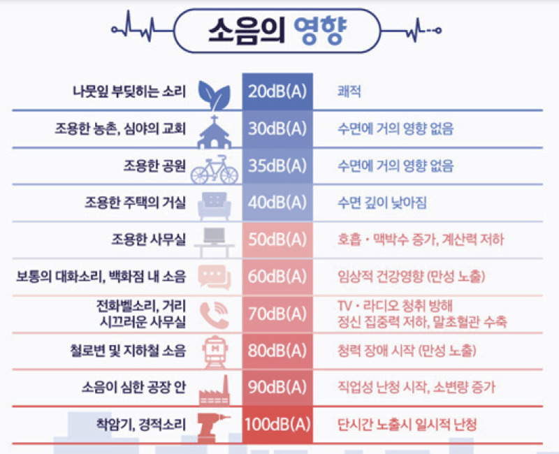 위 환경부 통계포털의 소음 기준을 보면 아시겠지만 사람이 잠을 잘 때 방해받지 않으려면 40dB(데시벨) 보다 낮아야 합니다.