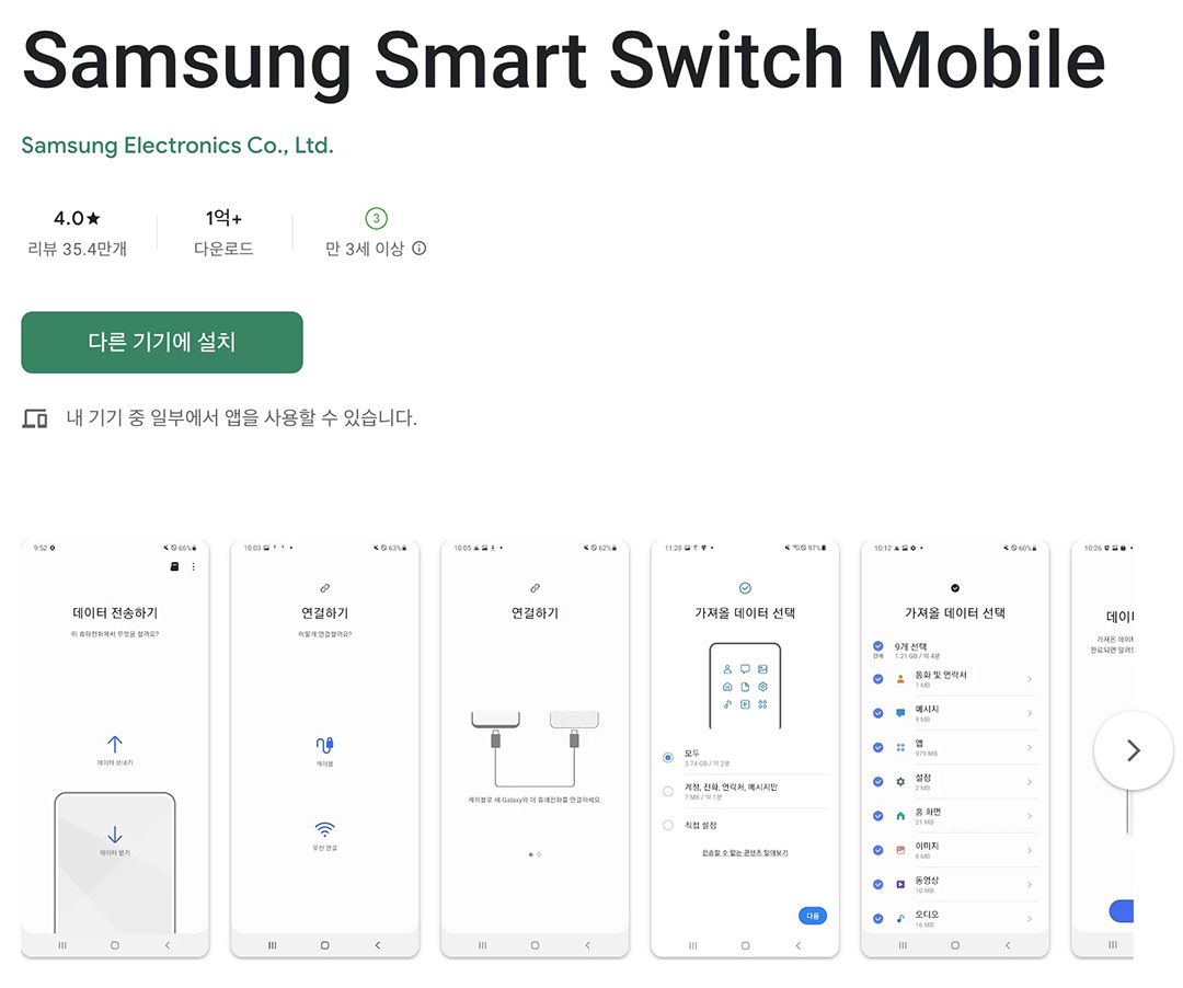 삼성 스마트 스위치는 구글플레이에서 다운로드할 수 있으며 안드로이드 스마트폰이면 모두 설치할 수 있습니다.