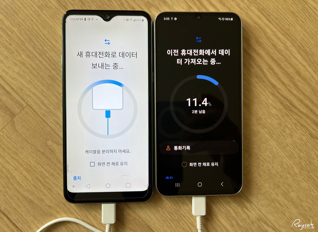 주의할 점은 두 단말기에서 모두 완료라는 화면이 나올때까지 케이블을 분리하면 안됩니다.