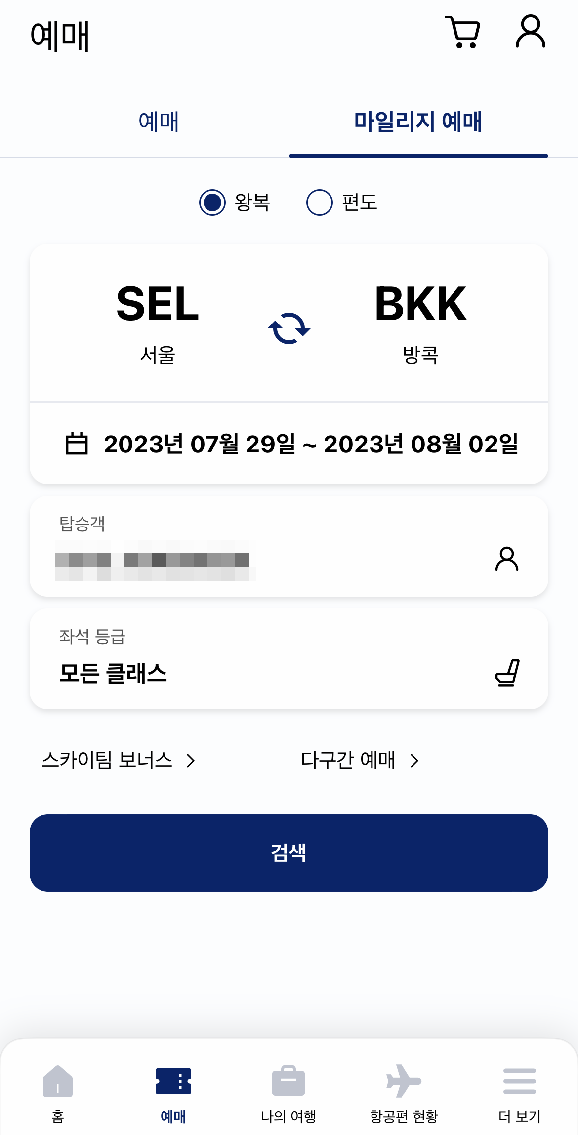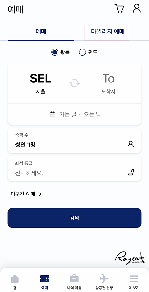 대한항공 앱에서 마일리지 예매를 선택합니다.