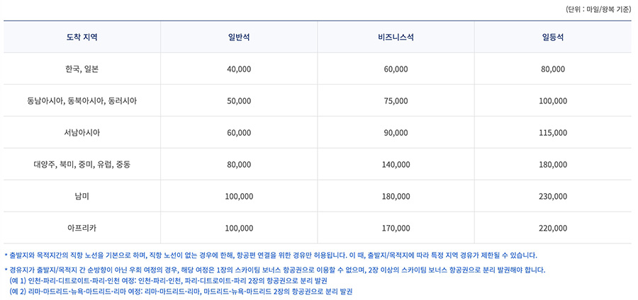 - 성수기, 비수기에 따라 마일리지 차감이나 세금, 유류할증료등 차이가 있습니다.