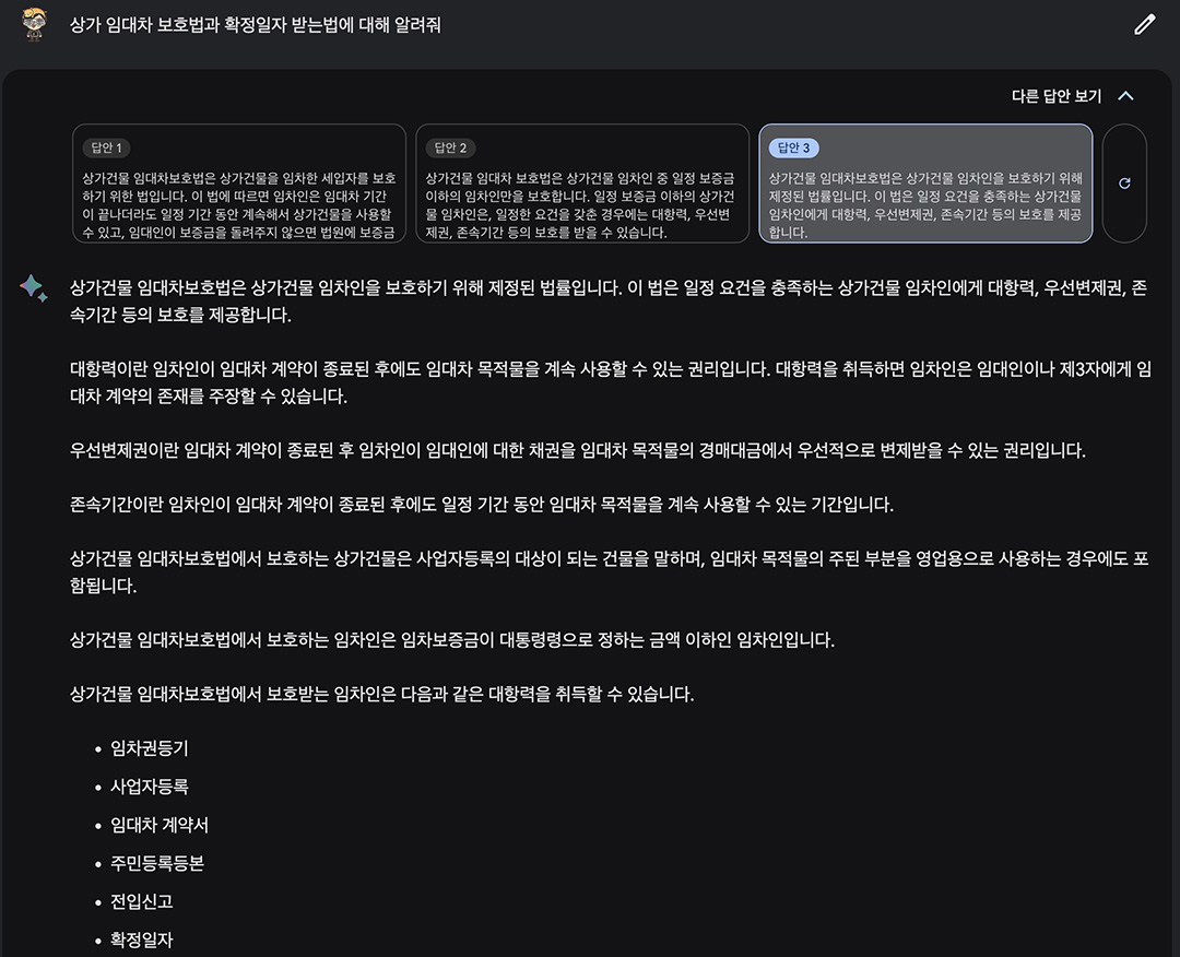 상가 임대차 보호법과 확저일자 받는법에 대한 질문을 했는데 기본 답변외에 다른 답변도 보여주는데 딱 교과서적인 답변이라고 할까?
