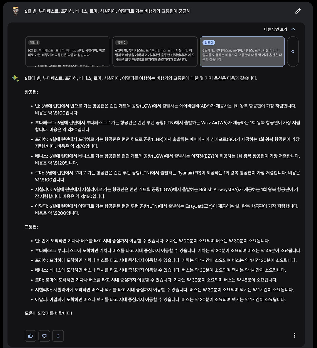 바드는 현재 기본 답변으로 바드는 3가지를 보여주는데 6월 유럽의 빈, 부다페스트, 프라하, 베니스, 로마, 시칠리아, 아말피로 가는 비행기나 교통편은 어떤게 있는지 물어봤는데 3번째 답변은 오답입니다.
