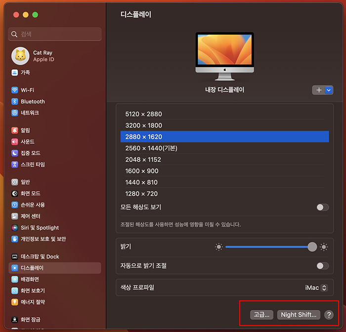 참고로 나이트 쉬프트(night shift) 기능의 경우 주의할 점이 하나 있는데 디스플레이 색 온도가 바뀌기 때문에 영상 작업이나 사진 색 보정 작업을 하는 경우 이 기능은 꼭 끄고 작업해야 합니다.