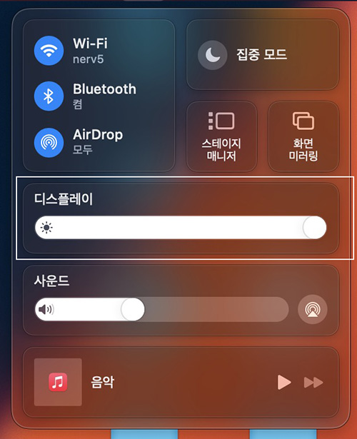 빠르게 디스플레이를 밝기를 조절하거나 다크 모드를 켜거나 나이트 쉬프트를 on/off 할때 사용할 수 있습니다.