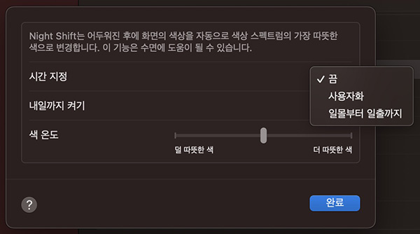 디스플레이의 색 온도를 덜 따뜻하거나 더 따뜻하게 할 수 있는데 나이트 쉬프트(night shift) 기능은 눈에 해로운 블루라이트를 차단해 모니터의 색이 좀 노랗게 바뀌게 됩니다.