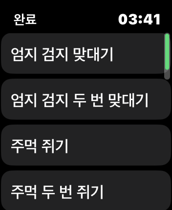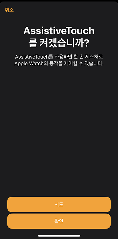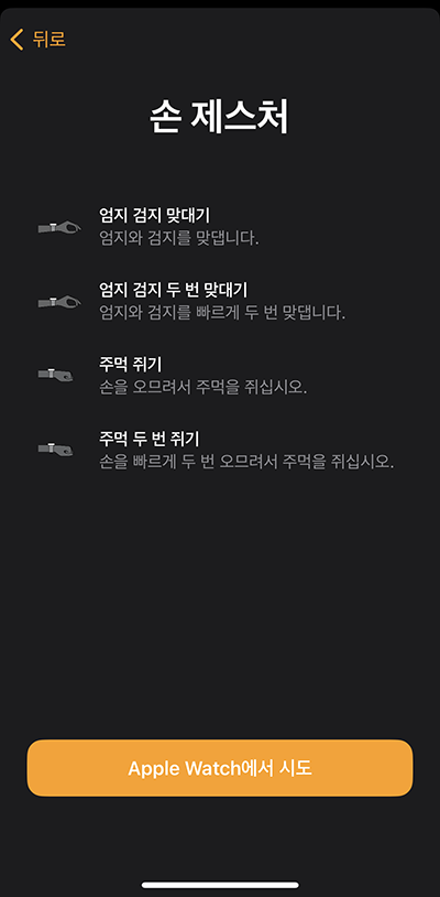 워치 설정에서 손쉬운 동작 -> AssistiveTouch를 켜고 워치에서 테스트를 하면 바로 사용할 수 있습니다.