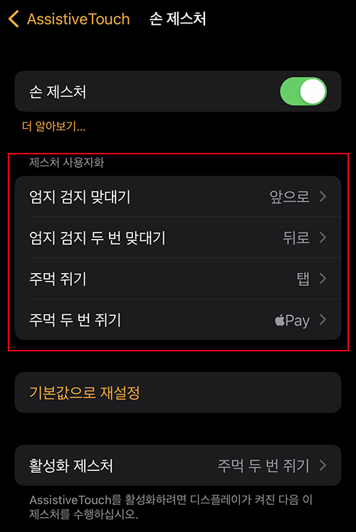 이전에 AssistiveTouch의 손 제츠처 기능에 오류가 있어서 제대로 활용을 못했는데 이번에 다시 설정하고 사용해 보니 빠르게 인식하고 잘 동작하니 이제 AssistiveTouch에 애플페이를 설정하고 사용해도 좋을 것 같습니다.