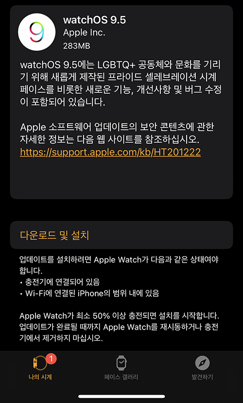 워치OS 업데이트는 워치앱에서 실행할 수 있으며 업데이트는 대략 10~15분 정도 소요됩니다. 업데이트 전 애플워치 배터리는 50% 이상 충전되어 있어야 업데이트가 가능합니다.