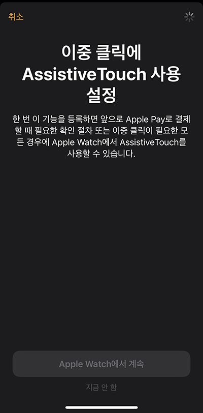 아마 애플워치에 애플페이를 사용하는 분들이라면 AssistiveTouch의 버그 때문에 애플페이 결제 시 제대로 동작하지 않는 경우가 있었는데 이번에 테스트해보니 잘 동작하니 이 기능을 켜고 사용해도 될 것 같습니다.