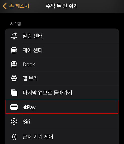 손 제스처의 기능 중 주먹 두 번 쥐기를 저는 애플페이로 지정해 두고 사용하고 있습니다.