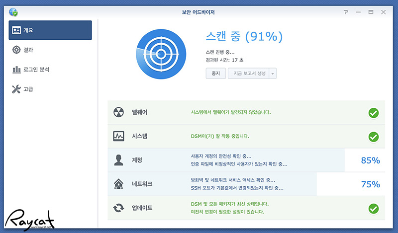 시스템 크기에 따라 소요되는 시간은 다르지만 10~20분 정도 소요되며 맬웨어, 시스템, 계정 보안, 네트워크, DSM 업데이트를 체크해 보여줍니다.