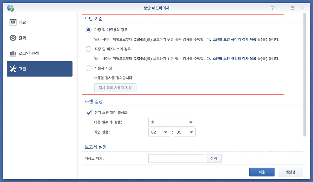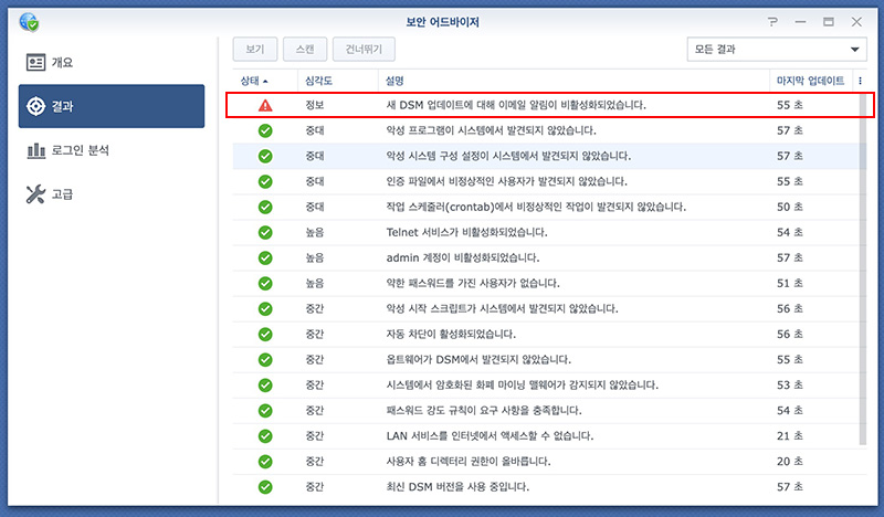 제 경우 매주 체크해보고 있는데 시스템 보안이 궁금할 경우 보안 어드바이저로 한 번씩 스캔해 보면 DSM의 기본 시스템의 보안 상태를 확인해 볼 수 있습니다.