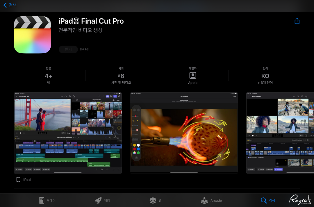 참고로 지원하지 않는 아이패드에서 파이널컷 프로를 검색해 보면 지원하지 않는 기기라며 메시지가 나옵니다.