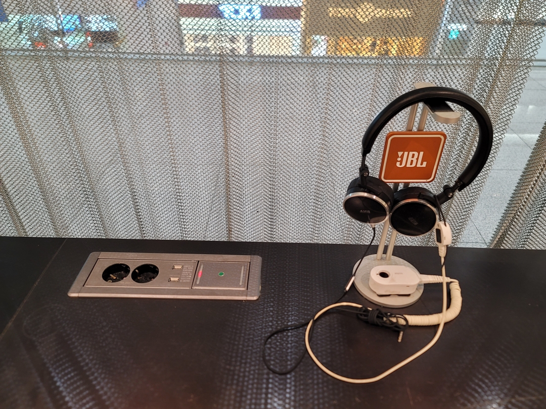 모든 좌석에 콘센트가 있는데 창가 쪽 자리에 무선충전과 함께 JBL 헤드셋을 청음해 볼 수 있습니다.