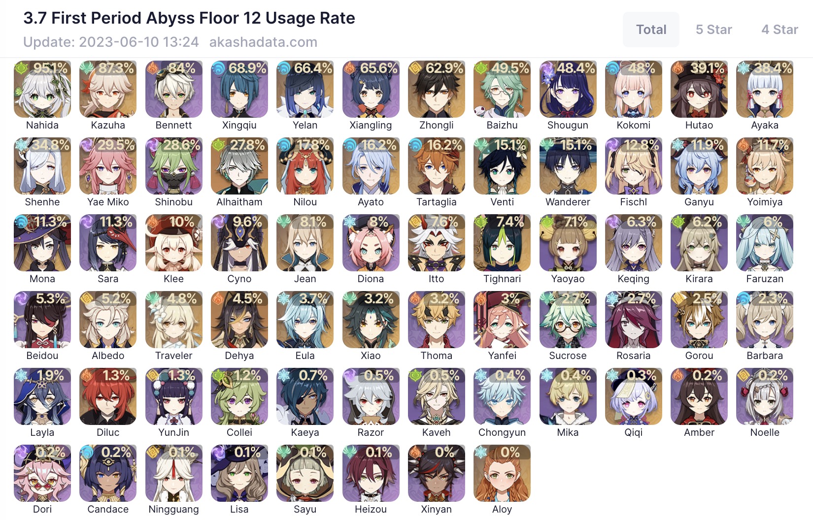 나히다의 픽률이 90%가 넘는데 나히다를 보유한 사람은 대부분 12층 후반부에서 나히다를 모두 썼을것 같습니다. 그리고 12층 전반부는 카즈하나 벤티가 있으면 컨트롤을 잘 한다면 빙결팟이 상당히 유리합니다.
