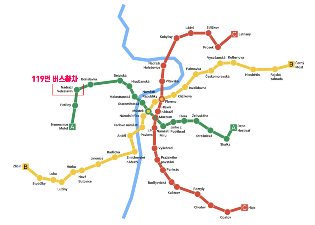 공항에서 119번 버스를 타고 Nádraží Veleslavín에서 하차하면 됩니다. 대부분 프라하 관광객이면 Nádraží Veleslavín에서 모두 하차하는데 공항에서 20~25분 정도 소요됩니다.