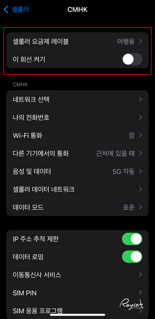 그리고 간혹 국내 통신사 서비스로 데이터 로밍이 자동으로 연결되는 경우가 있는데 메인 회선의 데이터 로밍은 차단하고 나는 게 좋습니다. 대부분 데이터 로밍은 요금이 따로 부과되기 때문에 출국 전에 설정 - 셀룰러에서 한국 회선을 선택하고 데이터 로밍을 끄면 됩니다.