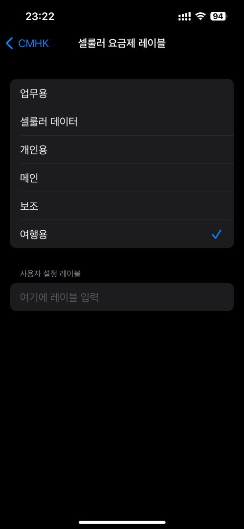 등록된 eSIM을 탭 하면 위 캡처 이미지처럼 나오는데 제경우 eSIM의 셀룰러 요금제 레이블을 여행용으로 바꿨습니다. 기본은 보조라는 이름으로 나옵니다.