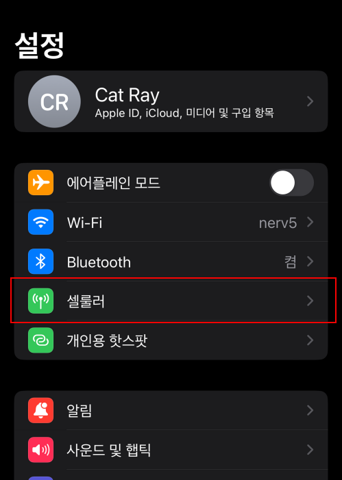 아이폰에서 esim 설정은 간단한데 설정 - 셀룰러를 선택합니다.