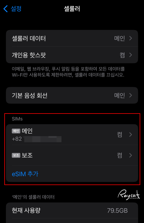 셀룰러를 선택해 보면 SIMs 항목에 메인 그리고 보조 eSIM 추가를 볼 수 있습니다. 메인은 이름 그대로 현재 한국에서 부여받은 통신사의 회선이며 보조는 기본 이름 그대로 등록한 eSIM입니다.
