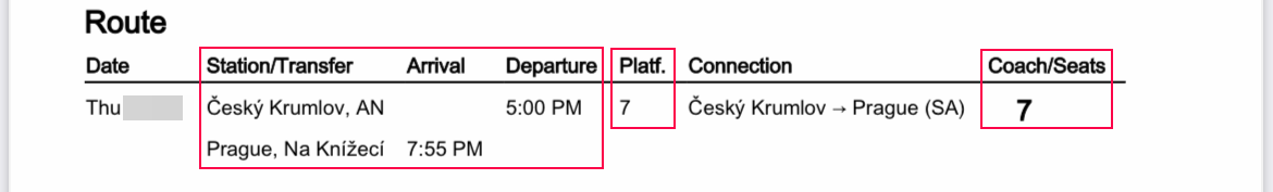 내 경우 체스키크룸로프에서 프라하로 가는 티켓도 이미 한국에서 예매했기 때문에 omio 앱으로 열고 플랫폼 넘버를 확인하고 대기했다. Platf.가 플랫폼 넘버로 위 캡처화면에 보면 7번 플랫폼이며 내 좌석도 7번으로 지정되어 있다.