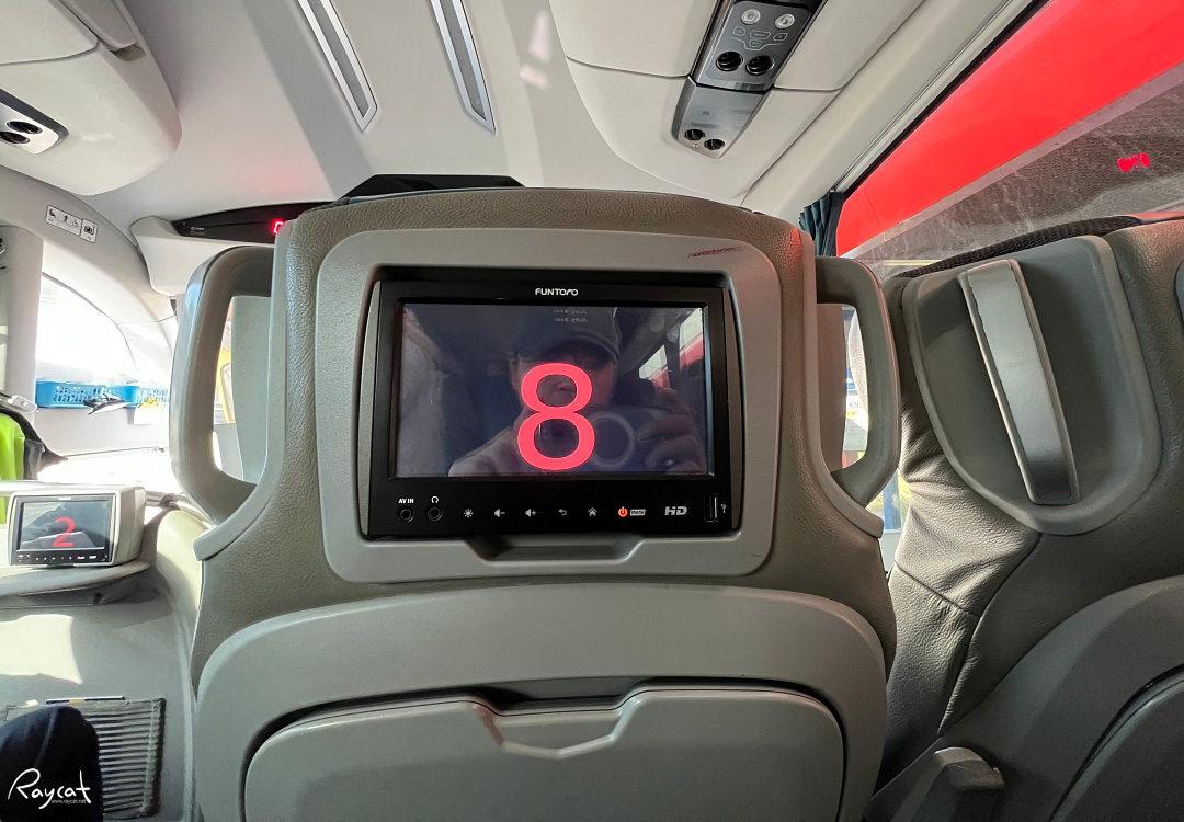 좌석 앞쪽 모니터에 이렇게 자리 표기가 있는데 내 자리는 8번이다. 리오젯 버스의 좌석은 넓고 편해서 장시간 이동이긴 했지만 불편하지 않았다.