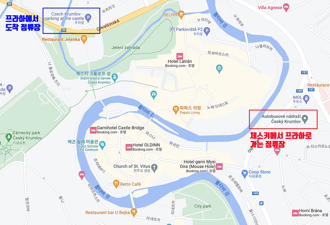 위 지도 캡처화면에서 푸른색 네모로 된 정류장은 체스키크룸로프에 도착했을 때 정류장이며 아래쪽에 붉은 네모로 표기된 정류장은 체스키크룸로프에서 프라하로 가는 버스가 정차하는 버스 정류장이다.