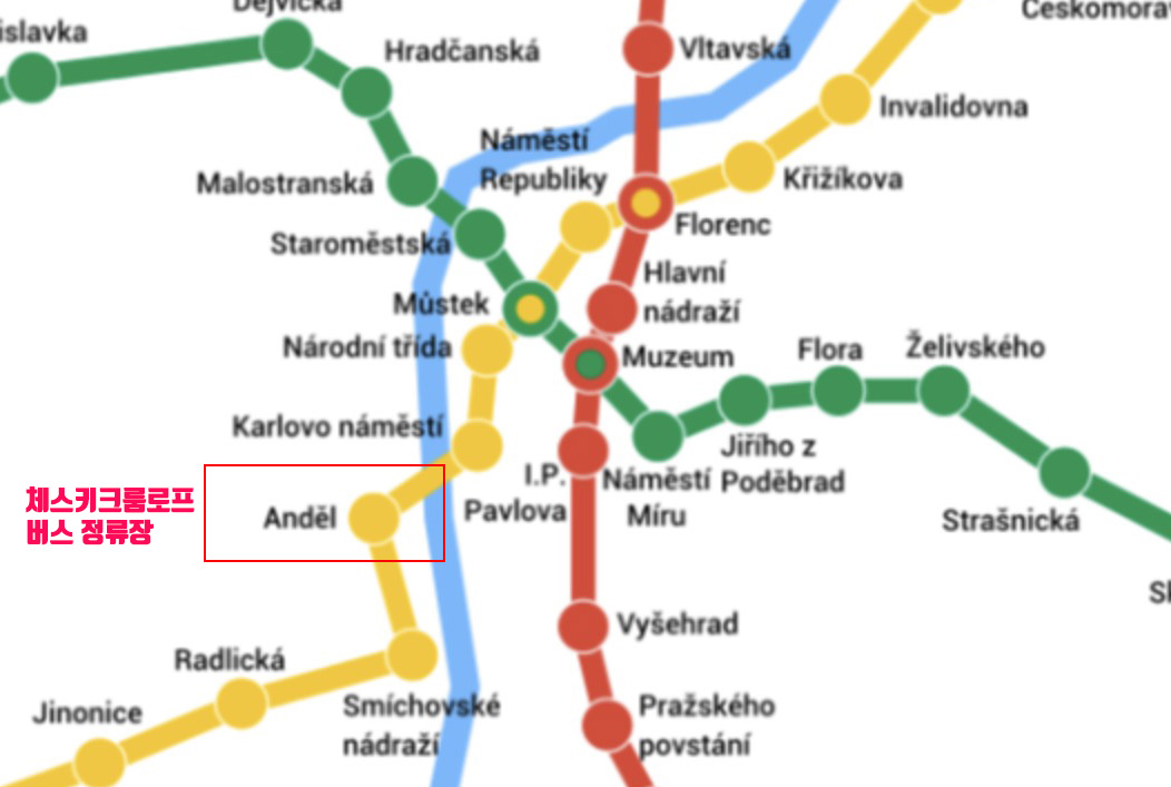 먼저 프라하에서 체스키크룸로프로 가는 버스 정류장은 Autobusové nádraží로 지하철을 이용하면 B노선(yellow) Andel(안델)역 지상에 있는 버스정류장이다.