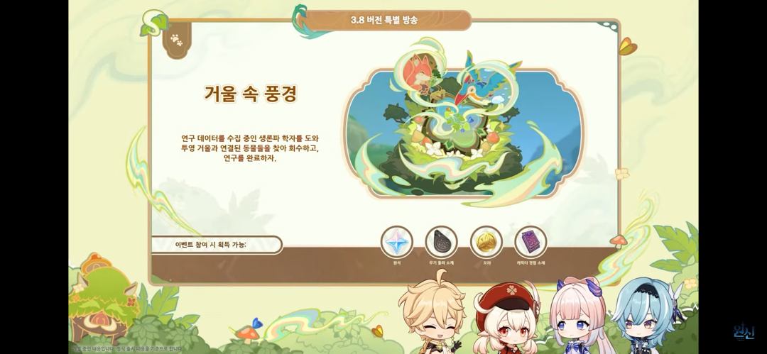 이번 원신 3.8 특별방송에 출연한 캐릭터는 코코미, 클레, 유라 그리고 여행자 성우가 함께 진행했습니다.
