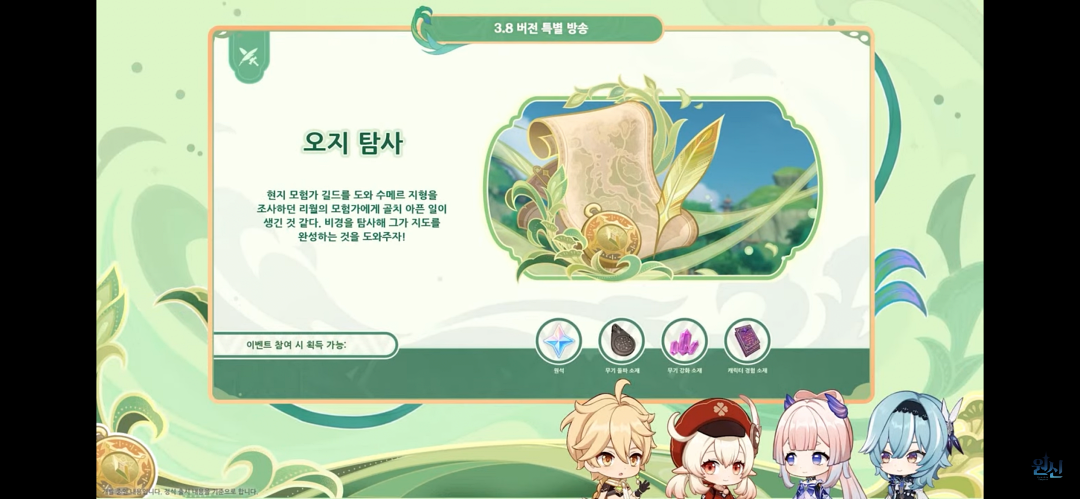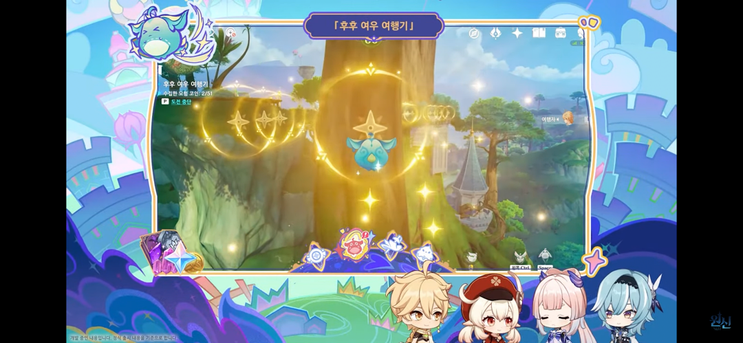 이제 여름이라 원신도 3.8 버전에서 여름을 테마로 진행하는 이벤트가 진행됩니다. '여름! 낙원? 대비경'이 메인이벤트로 사막에 있는 병 속을 여행하는 이벤트로 진행되는데 이전에 여름이면 금사과 제도를 여행했는데 금사과를 대체하는 이벤트 같습니다.