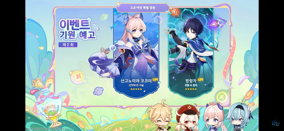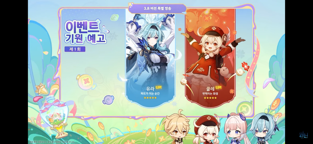 먼저 원신 3.8 버전 특별방송에서 가장 궁금하게 생각하고 있을 픽업을 살펴보면 전반부는 유라와 클레, 후반부는 산고노미야 코코미와 방랑자입니다.