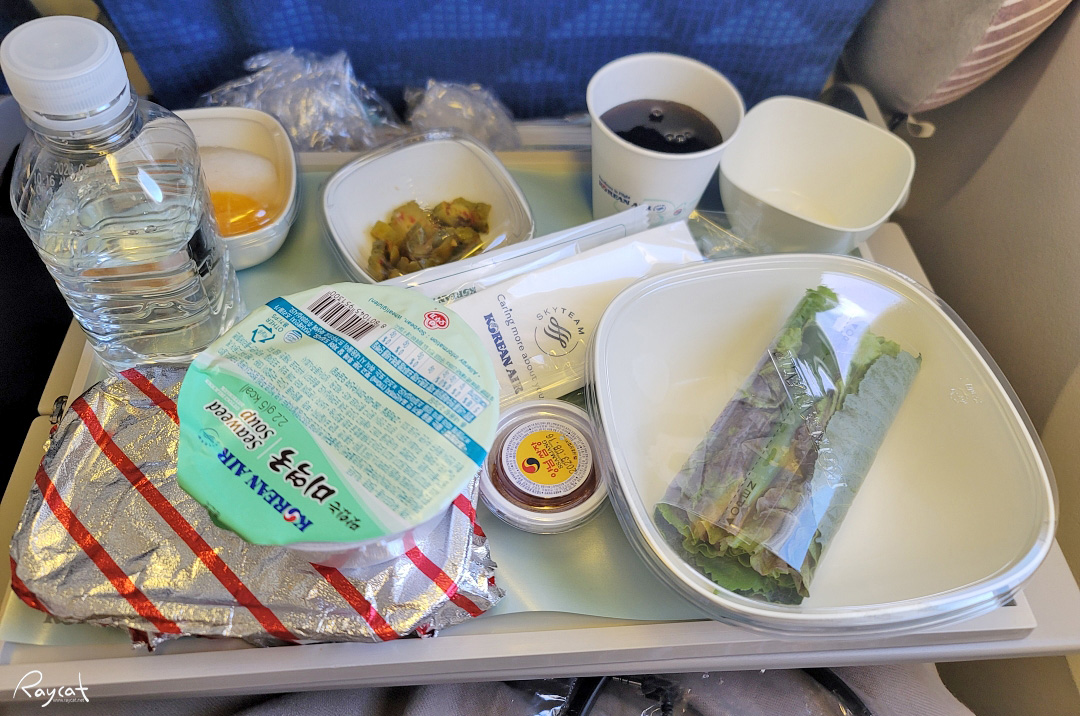 대한항공 쌈밥이 꽤 인기가 있는지 제 옆줄까지 쌈밥이 가능했고 나머지는 케이준 샐러드와 그라탕만 남아서 다음 식사에는 우리줄 먼저 와서 신청을 받았습니다.