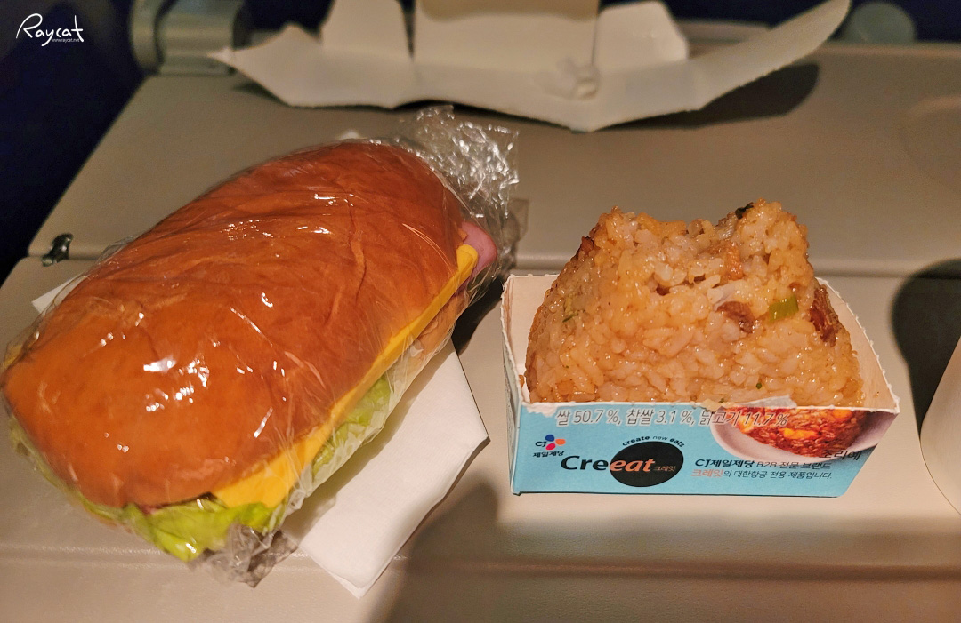 비행시간이 12시간이라 이륙하고 1시간쯤 지나고 한번 기내식이 나오고 또 중간에 한번 간식으로 햄치즈 샌드위치와 주먹밥이 나오는데 햄치즈 샌드위치보다 전 주먹밥이 더 맛있었습니다.