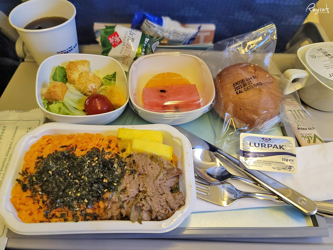 대한항공 기내식에서 제공하는 소고기 필라프는 한식 좋아하는 분들이 좋아할 것 같습니다. 샐러드와 함께 과일은 수박과 오렌지 그리고 빵과 함께 버터가 나오는데 전 빵은 별로여서 먹지 않았습니다.