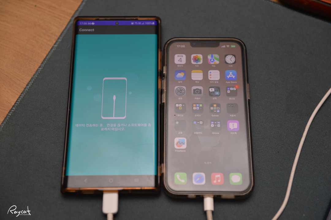 설정을 끝내고 갤럭시, 아이폰을 USB 케이블로 연결하면 애플리케이션 화면에 연결 성공이 나옵니다.