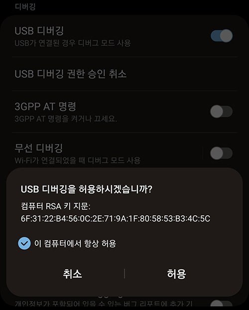 갤럭시 스마트폰을 USB로 연결하면 USB 디버깅을 허용하느냐 팝업이 올라오는데 여기서 허용을 누르면 됩니다.