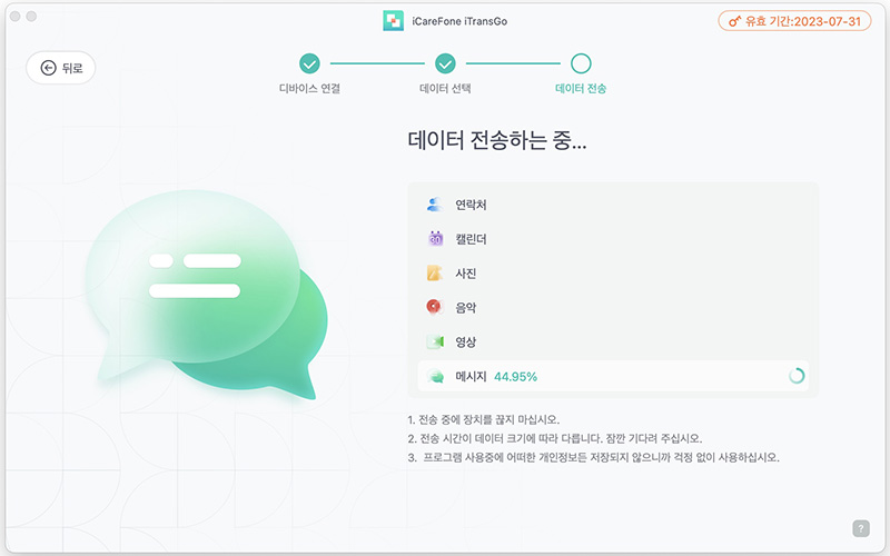사진을 포함한 메시지까지 5GB 정도의 데이터를 전송하는데 20~30분 정도 소요된 것 같습니다.