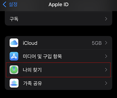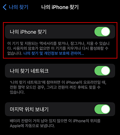그리고 아이폰의 경우 나의 찾기를 끄야 합니다.