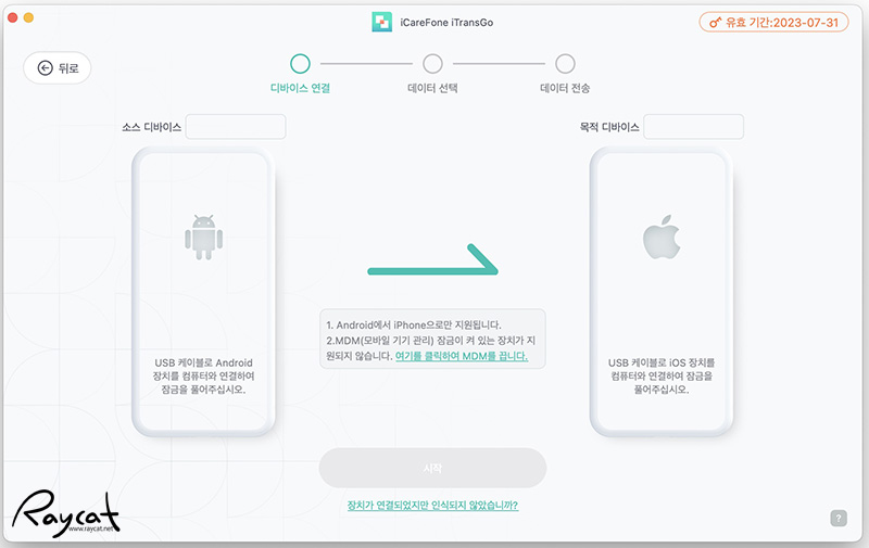 애플리케이션을 실행하고 시작하기를 누르면 위와 캡처와 같은 화면을 볼 수 있는데 데이터를 옮기고 싶은 안드로이드 스마트폰과 아이폰을 같이 맥에 연결해야 합니다.