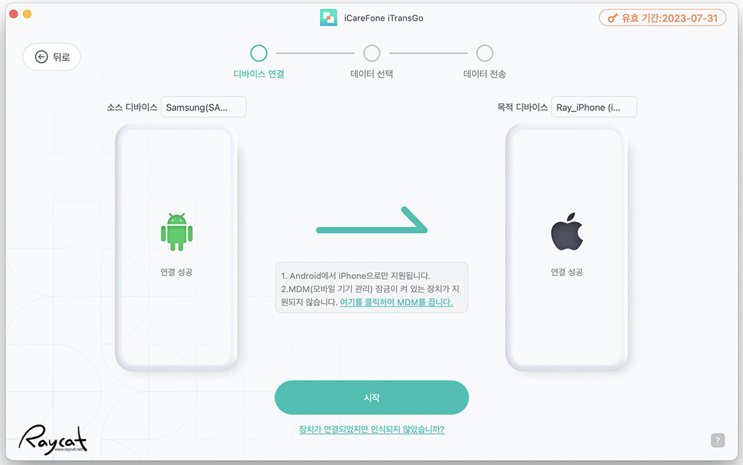 각각의 기기가 연결되어 있으면 이제 시작을 누르면 갤럭시에 있는 데이터를 아이폰으로 옮길 수 있습니다.