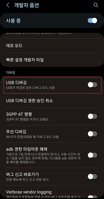 먼저 갤럭시 스마트폰의 경우 개발자 옵션을 활성화해서 USB 디버깅을 활성화해야 합니다.