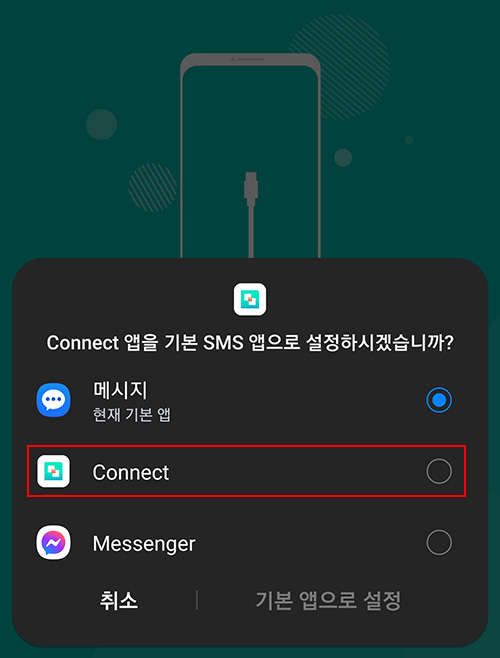 메세지 전송을 하게 되면 Connect 앱을 기본 SMS 앱으로 설정하라는 팝업이 나오는데 Connect 앱을 기본앱으로 변경하고 데이터 이동이 끝나고 다시 갤럭시 스마트폰의 메시지를 열면 기본앱을 바꿀 수 있으니 그때 다시 메시지로 변경해 주면 됩니다.