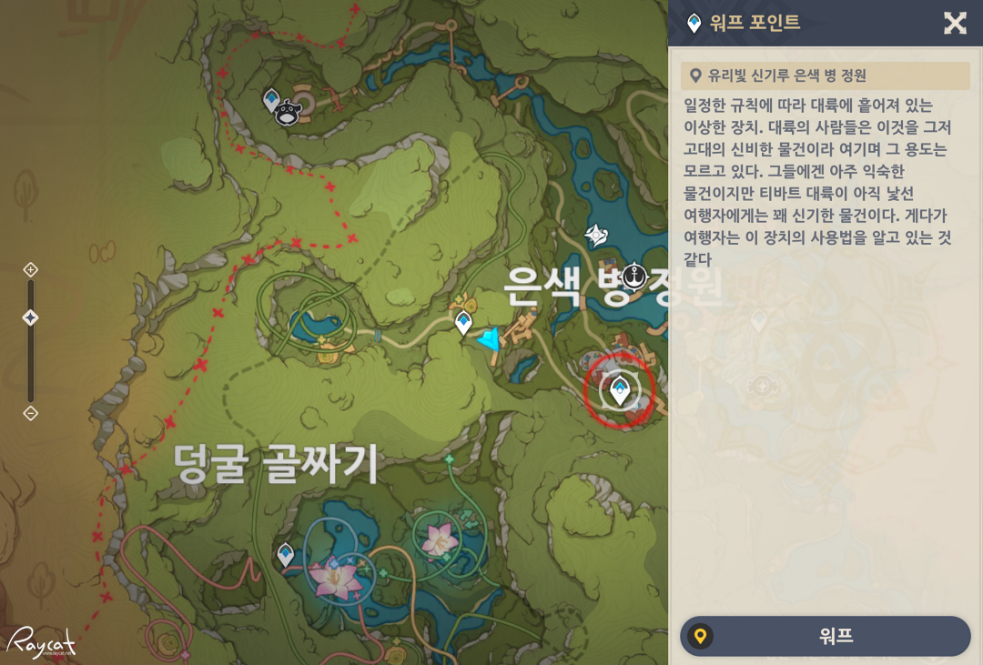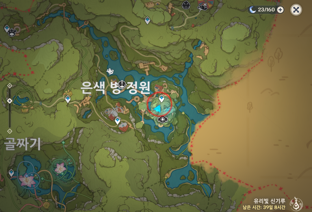 첫 번째 위치는 유리빛 신기루 맵에서 은색 병 정원으로 표기된 은자 바로 아래에 있는 워프를 타고 이동해야 합니다.