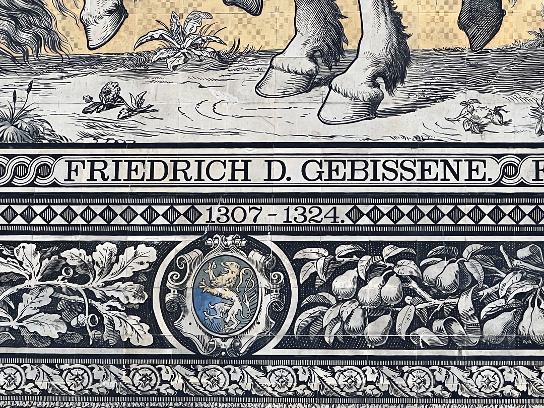 군주의 행렬은 독일 작센주의 왕조와 통치자들의 기마 행렬을 그린 것으로 처음에 일반 벽화로 그렸을 때 풍화작용으로 소실되어 18세기에 복원했으나 1907년에 지금의 타일 벽화로 바뀌었다.