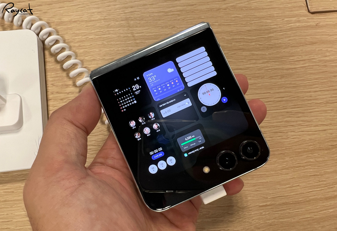 이번 갤럭시 Z플립5의 가장 변화로 느낄 수 있는 부분은 전면 커버 스크린으로 다양한 위젯을 활용할 수 있으며 폰을 펼치지 않고 접은 상태에서 사용하는 일이 더 많을 것 같습니다.