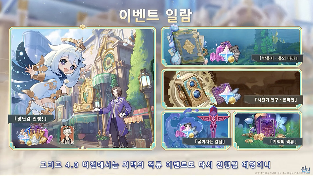 그리고 4.0 버전에서 마신 임무 외에 다른 미니 이벤트도 진행하는데 '장난감 전쟁', '박물지, 물의 나라', '사진기 연구- 폰타인', '굽이치는 칼날', '지맥의 격류' 진행됩니다.